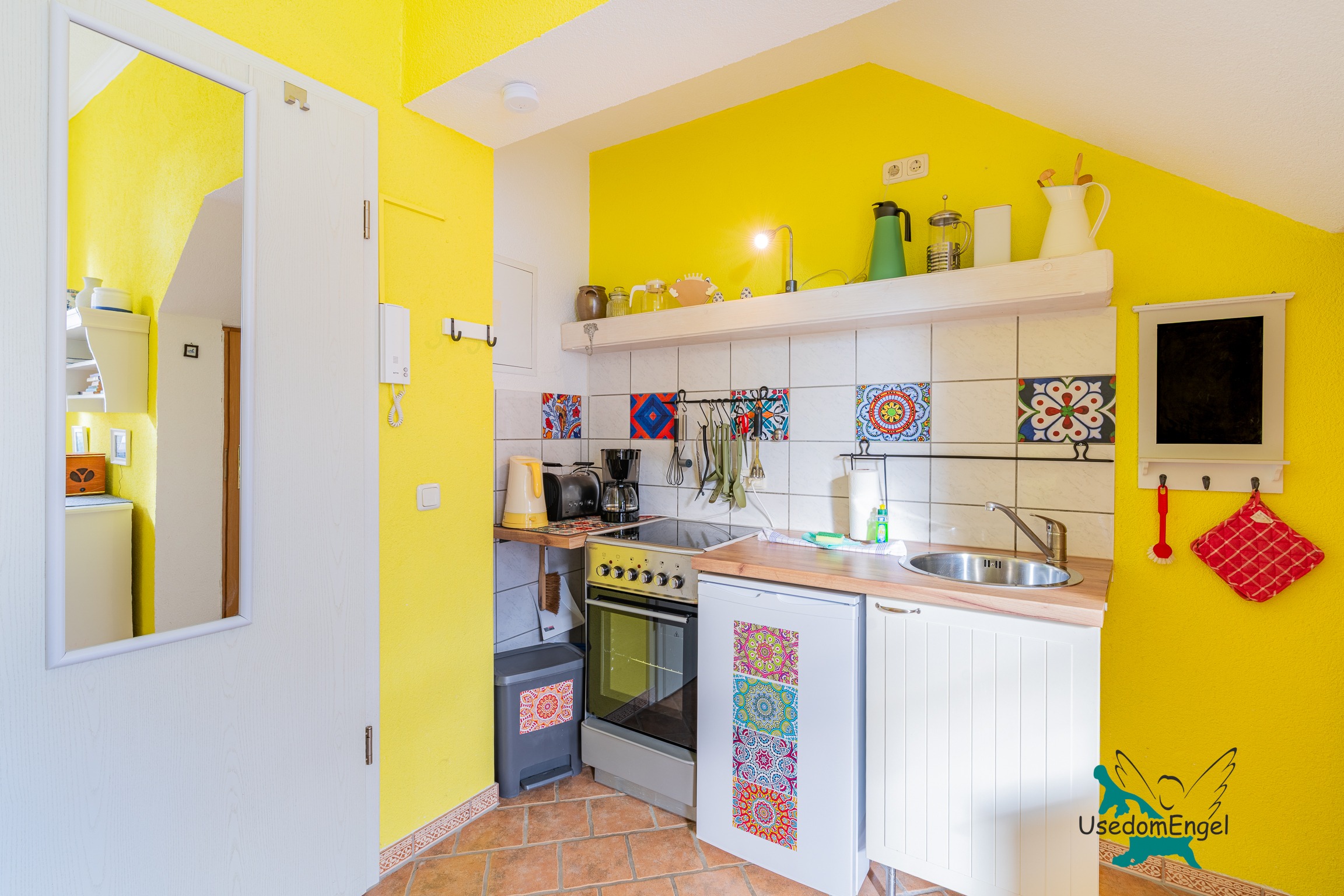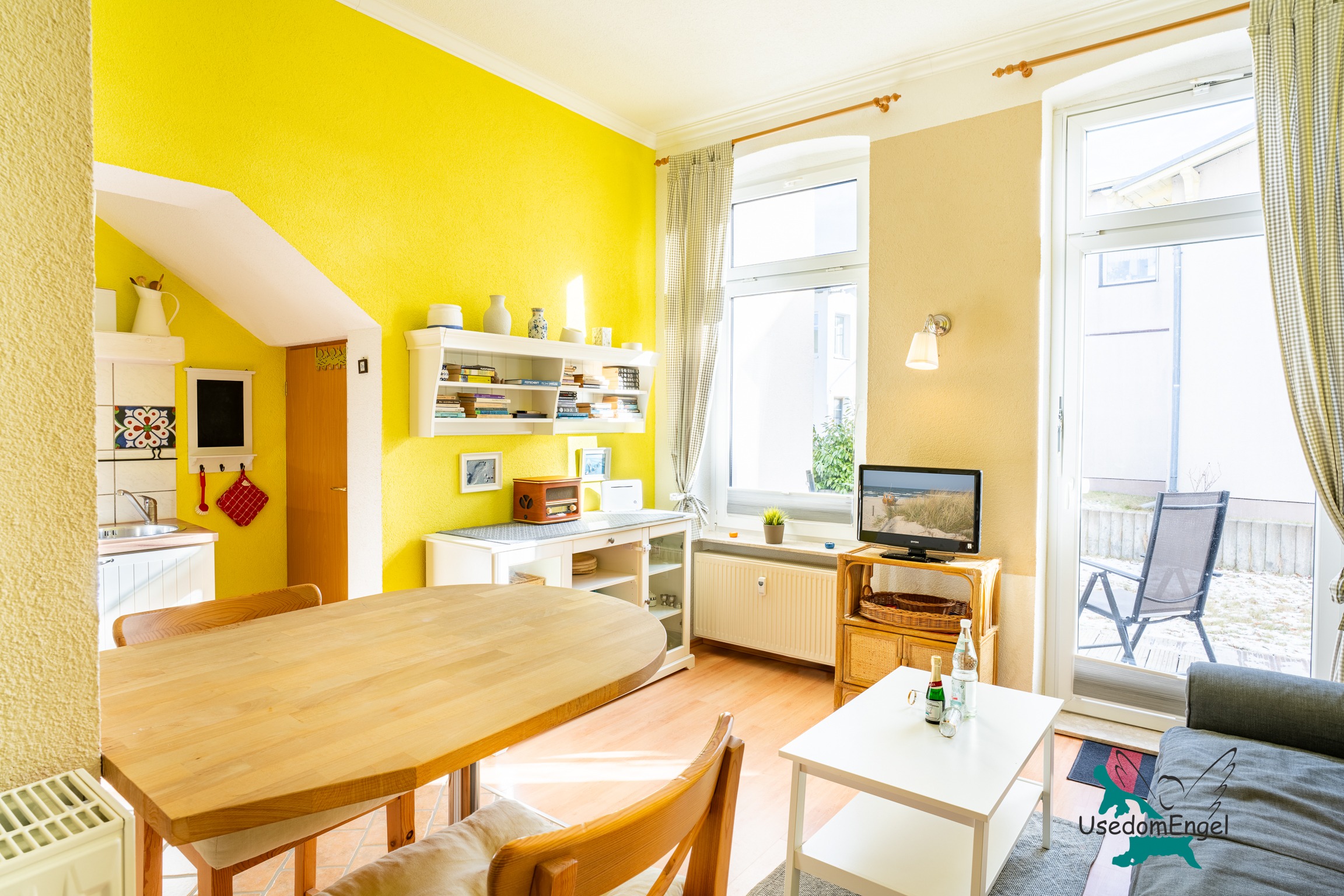 Das 27 qm große Appartment ist für bis zu zwei Personen ausgestattet. Es verfügt über einen Wohnbereich mit Essplatz für zwei Personen und eine gemütliche Couch. Vom Wohnzimmer aus erreichen Sie die Terrasse. Die Küche ist mit Herd, Kühlschrank, Kaffeemaschine und Toasrter ausgestattert.