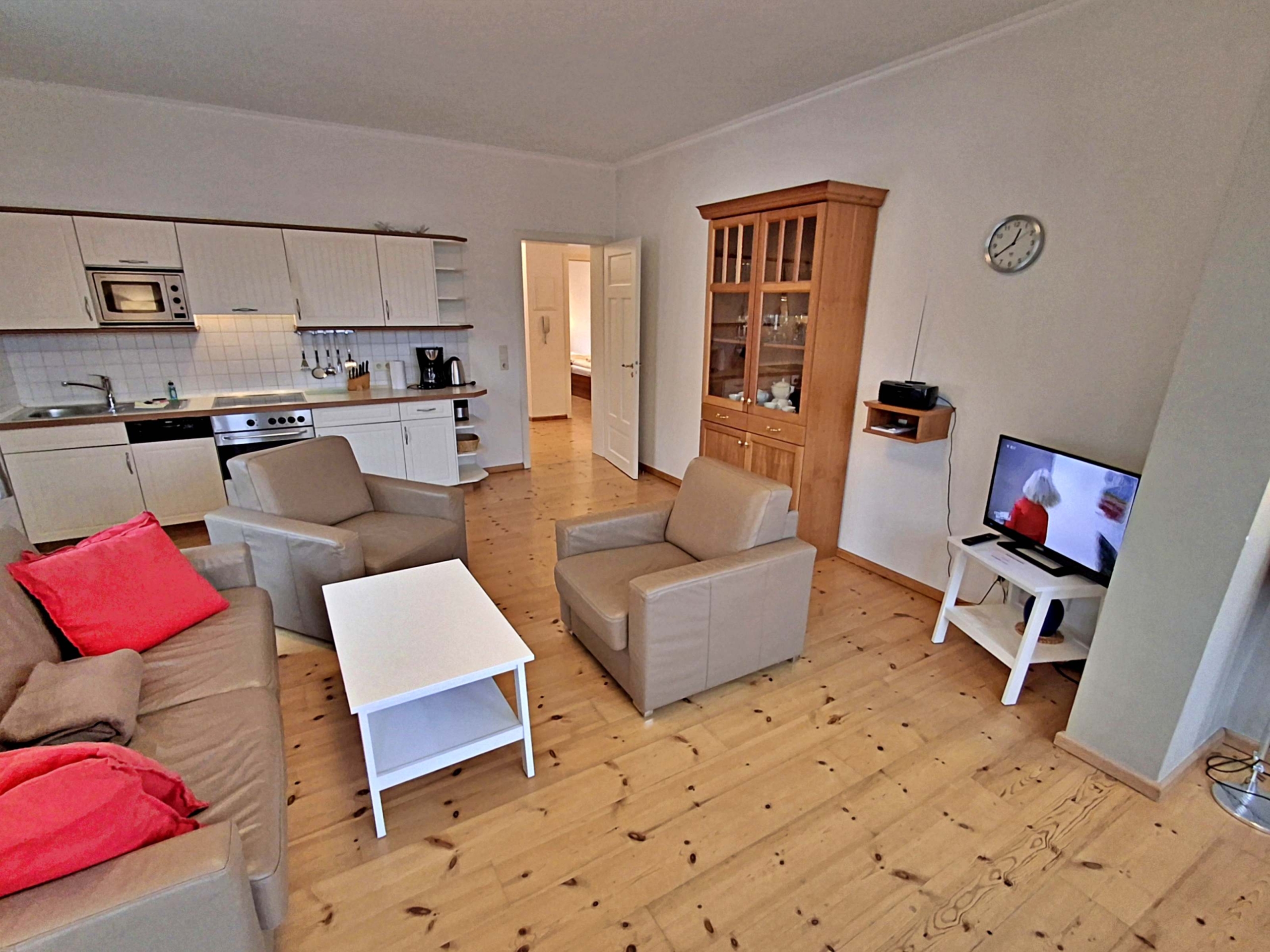 Wohnbereich mit Couch, Sessel und Esstisch, seitlicher Meerblick, Schlafzimmer mit Zugang zum möblierten Balkon, moderne Küchenzeile, Flachbild-TV, Radio-CD-Player und WLAN. Zwei Schlafzimmer (1x Doppelbett, 1x zwei Einzelbetten), Bad mit Badewanne/WC, zusätzliches Gäste-WC.