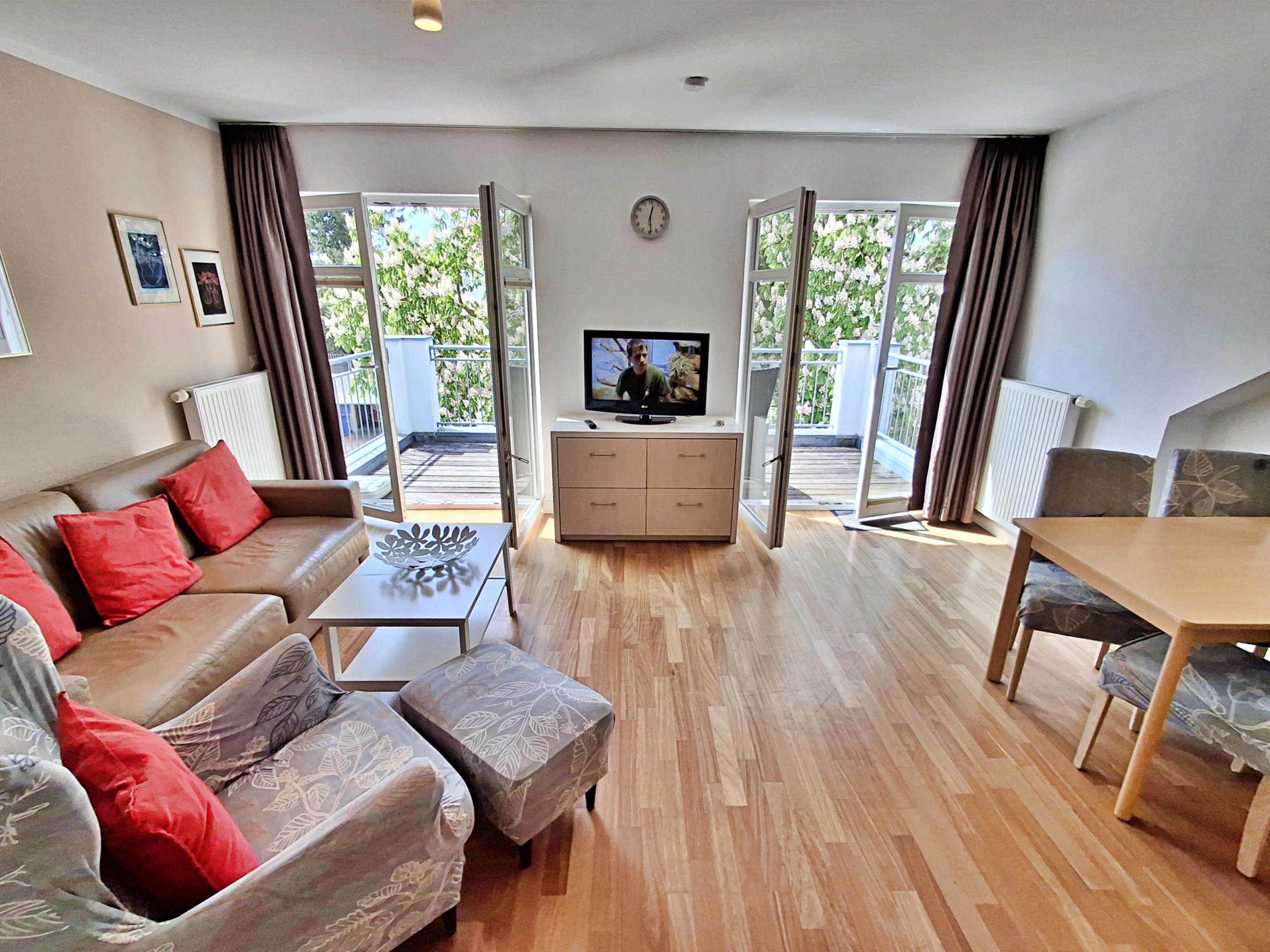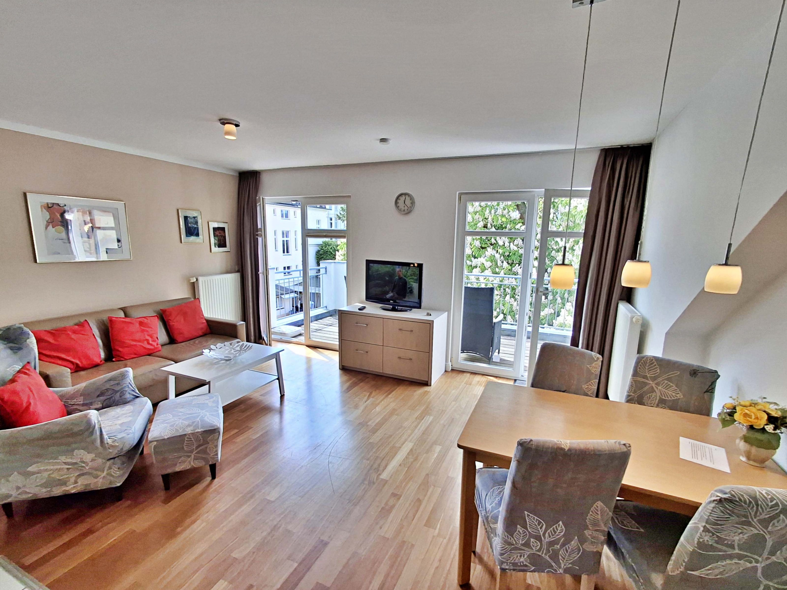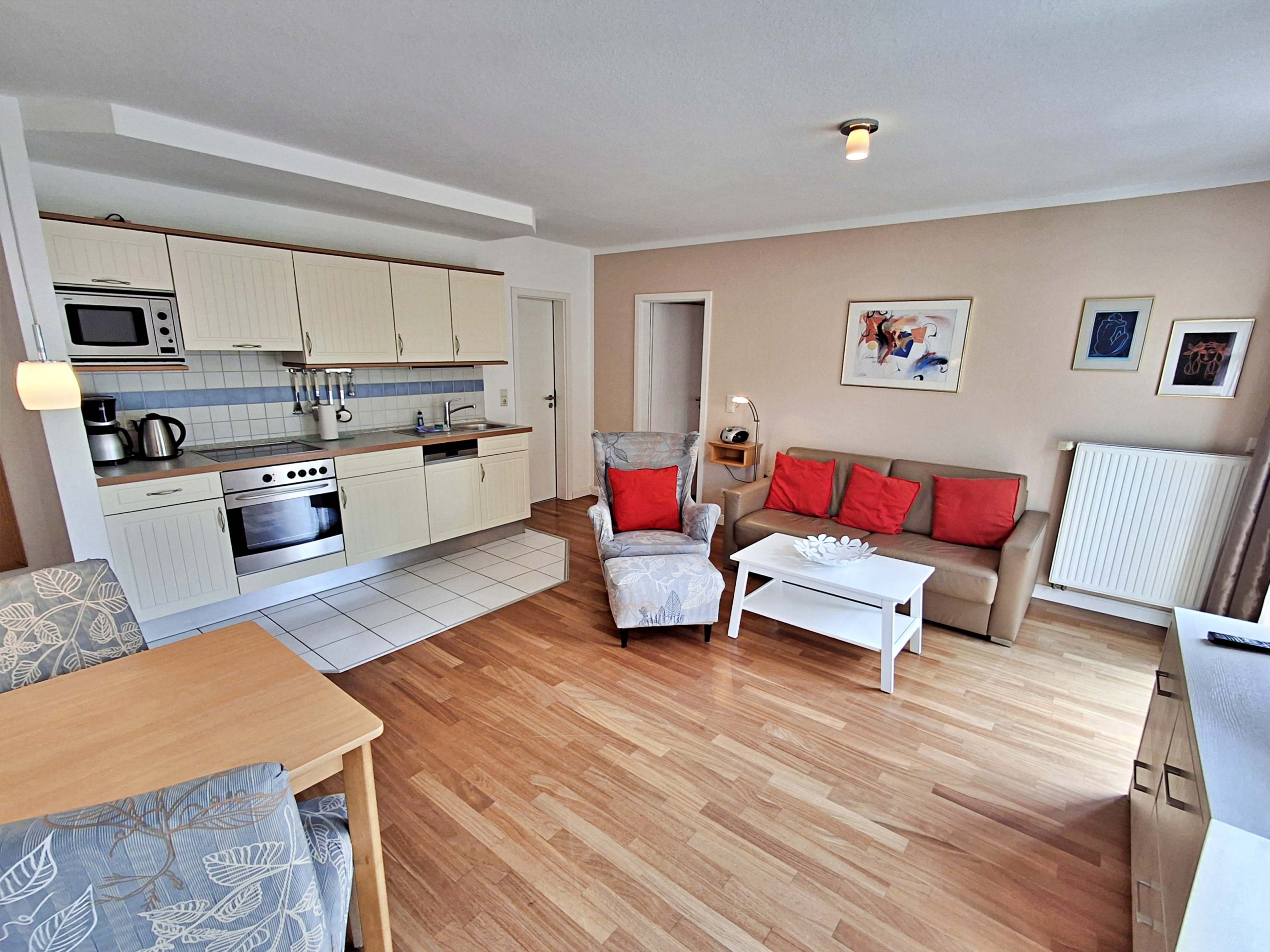 Wohnbereich mit Couch, Sessel, Esstisch für 4 Personen und Westbalkon für Kaffee am Morgen oder Abendentspannung. Moderne Küchenzeile, Flachbild-TV, Radio-CD-Player und kostenfreies WLAN. Schlafzimmer mit Doppelbett, Bad mit Dusche/WC.