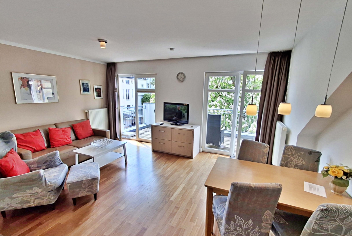 Die gemütliche Ferienwohnung Seeschwalbe liegt im 3. Obergeschoss des Nebengebäudes der stilvollen Villa Ahlbeck, nur wenige Schritte von Strand und Promenade. Sie bietet Platz für bis zu 3 Erwachsene und 1 Kind (bis 8 Jahre).