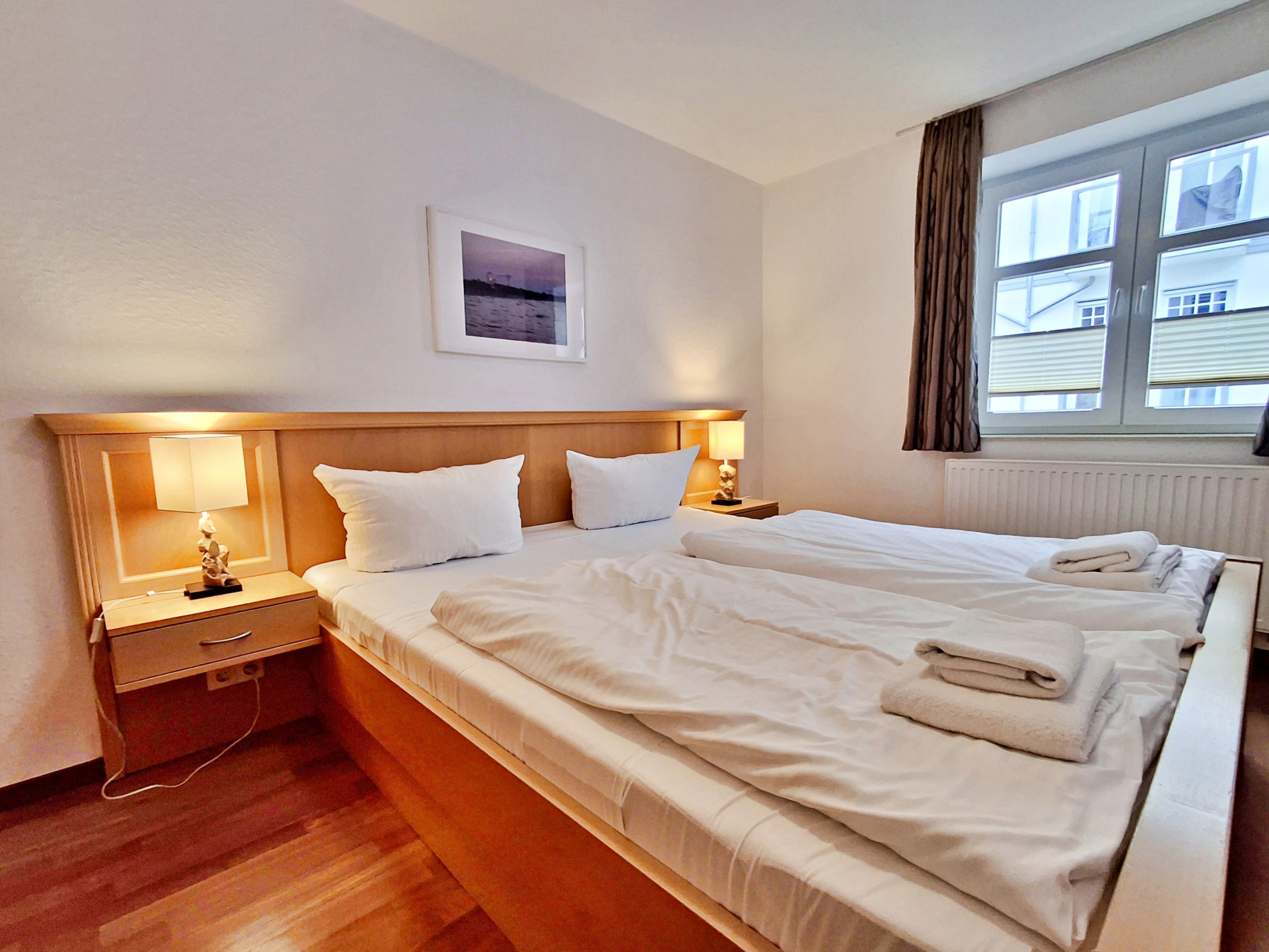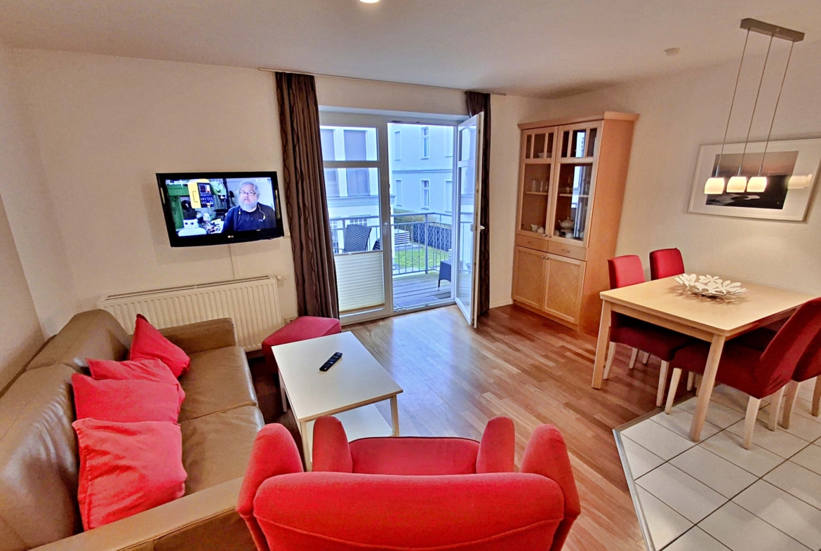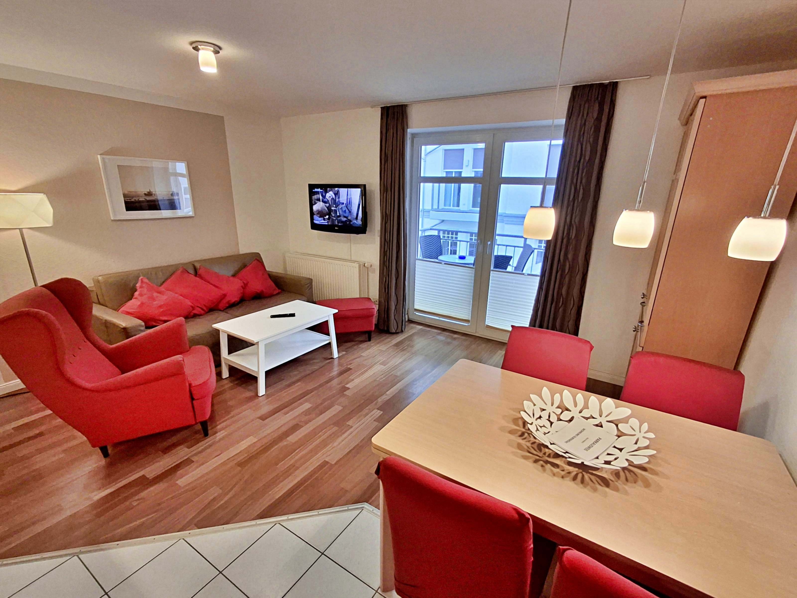 Wohnbereich mit Couch, Sessel, Essbereich und Nord-Ost-Balkon. Moderne Küchenzeile, Flachbild-TV, Radio-CD-Player, WLAN. Zwei Schlafzimmer mit Doppelbett und Frame-TV, Bad mit Dusche/WC.