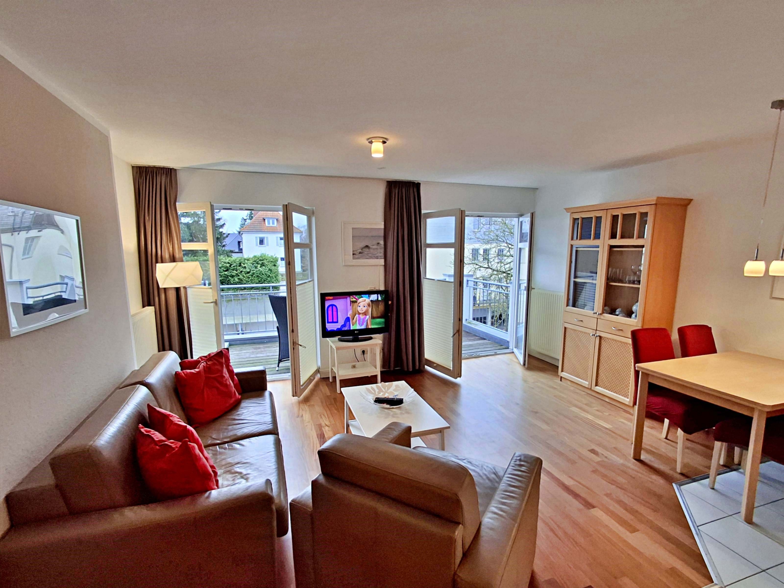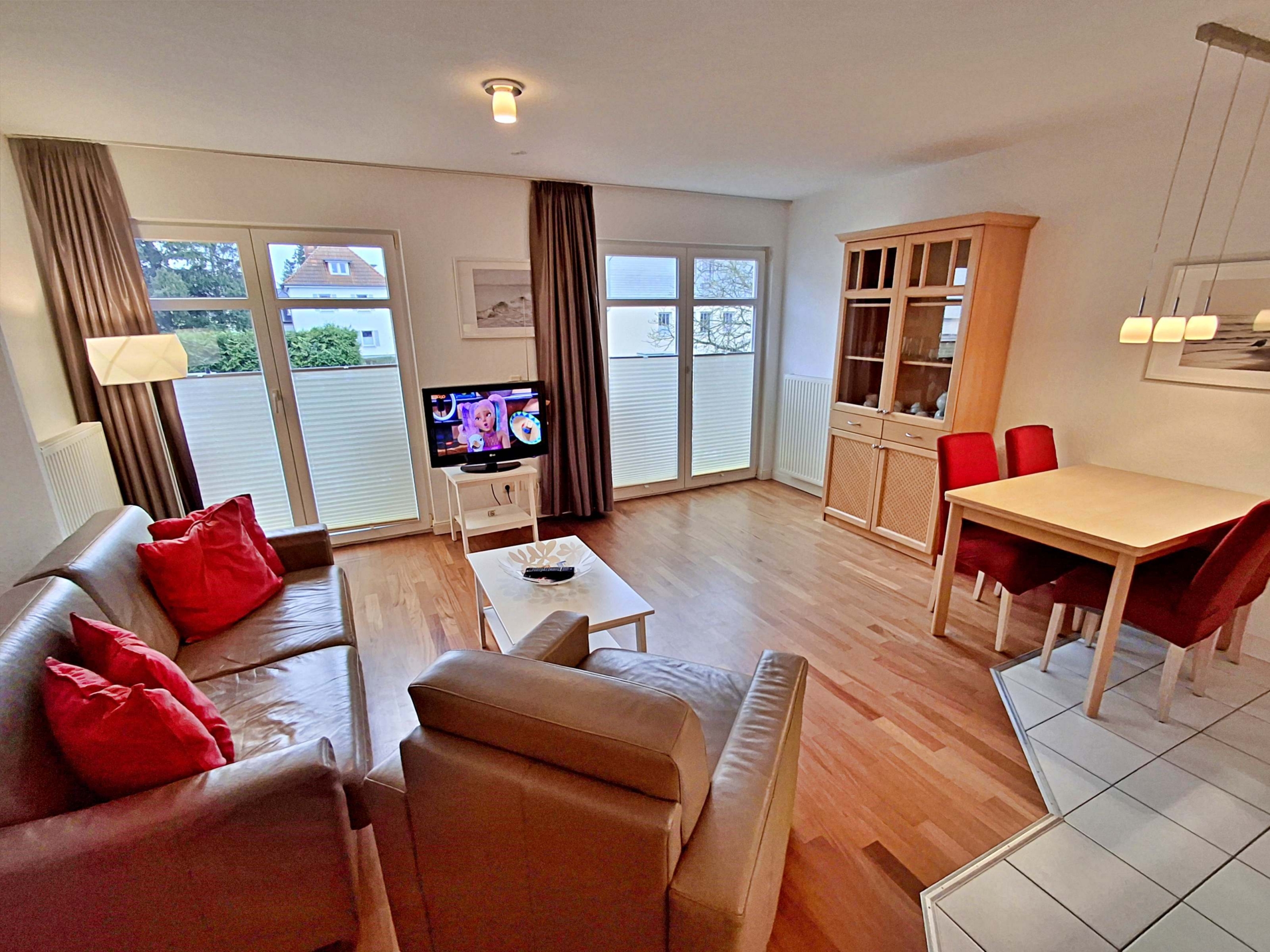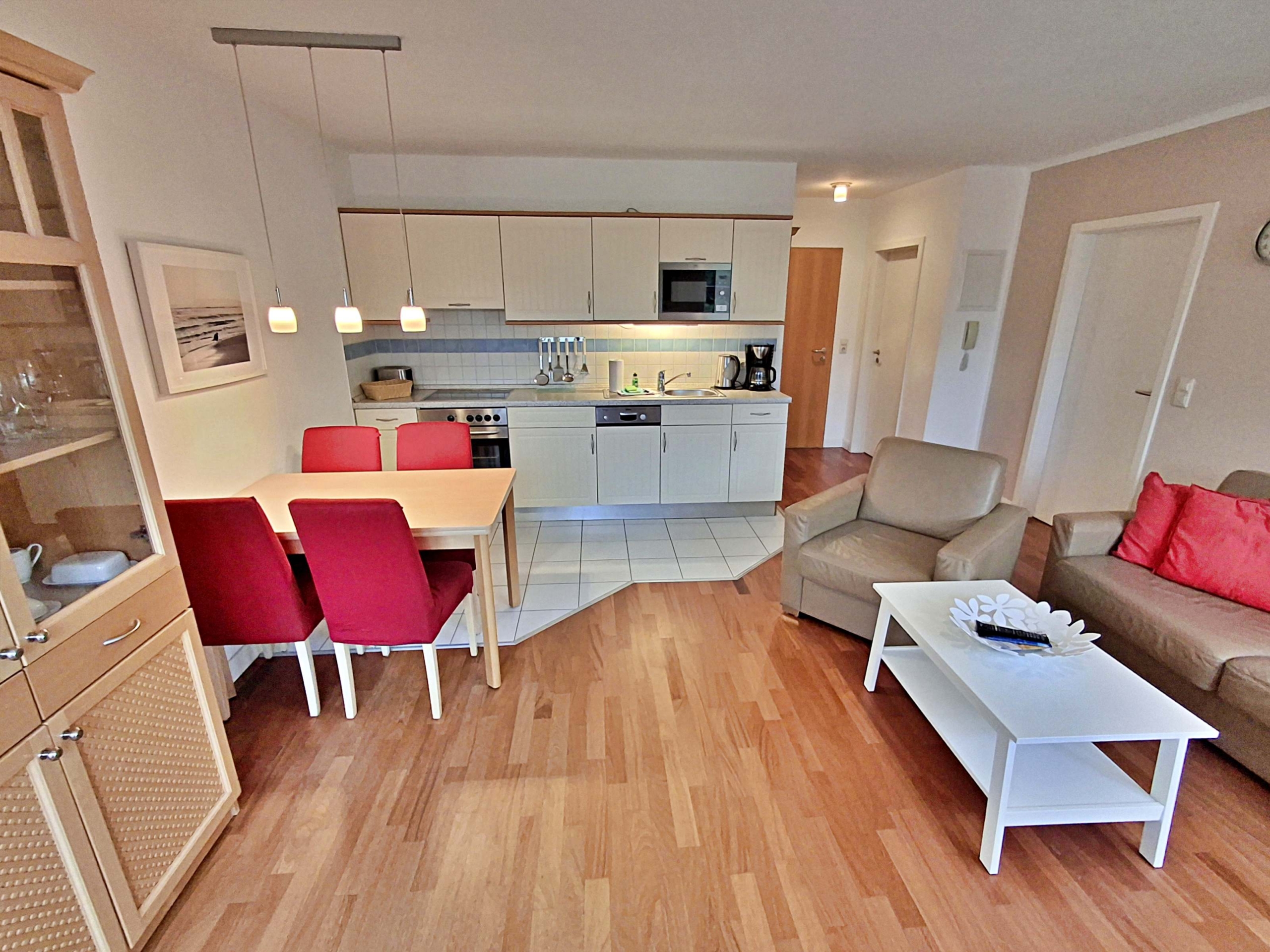 Wohnbereich mit Couch, Sessel und Esstisch, zwei Schlafzimmer mit Doppelbett sowie Bad mit Dusche/WC. Die voll ausgestattete Küchenzeile und kostenfreies WLAN sorgen für Komfort. Highlight ist der großzügige Süd-West-Balkon.