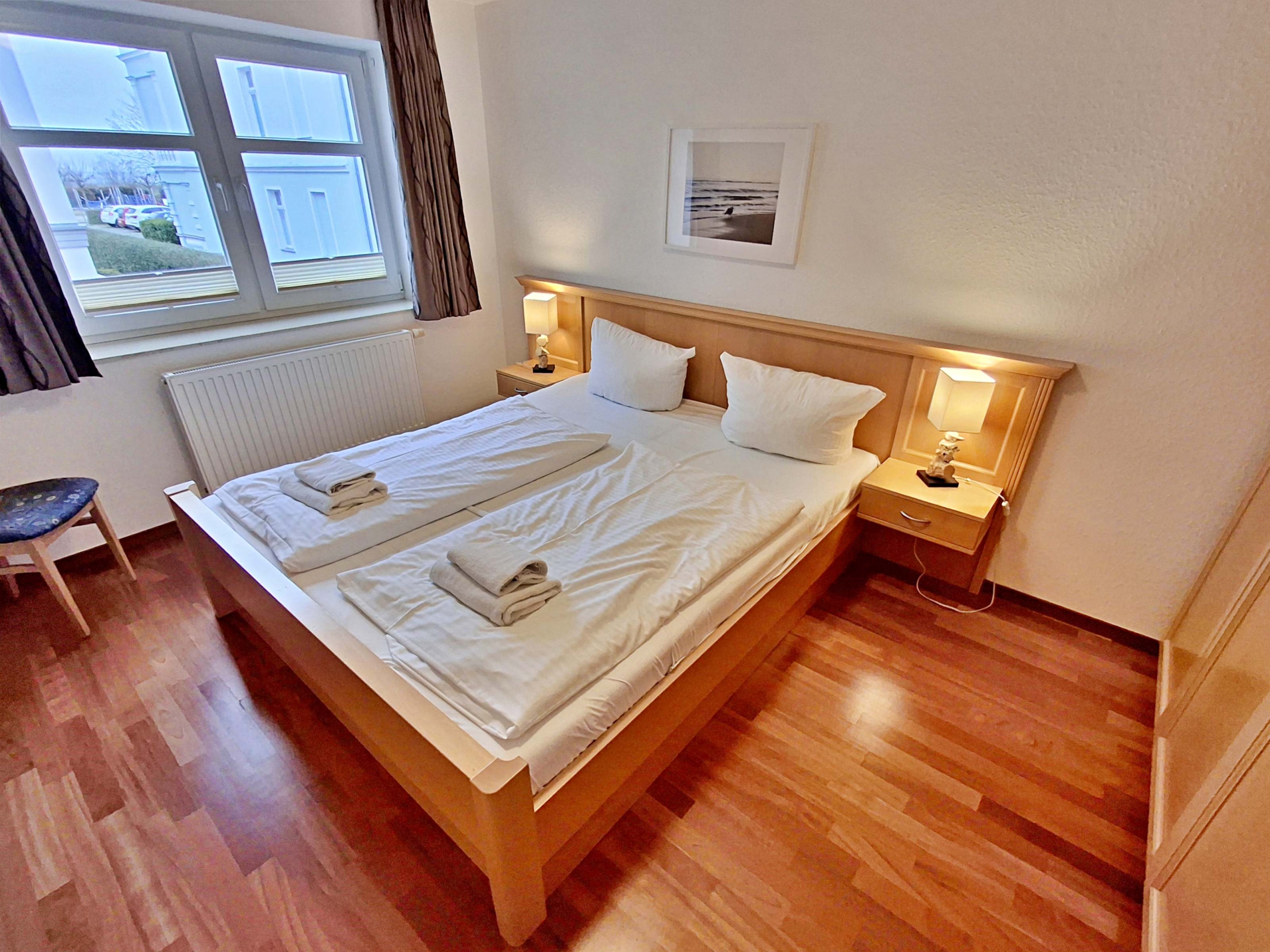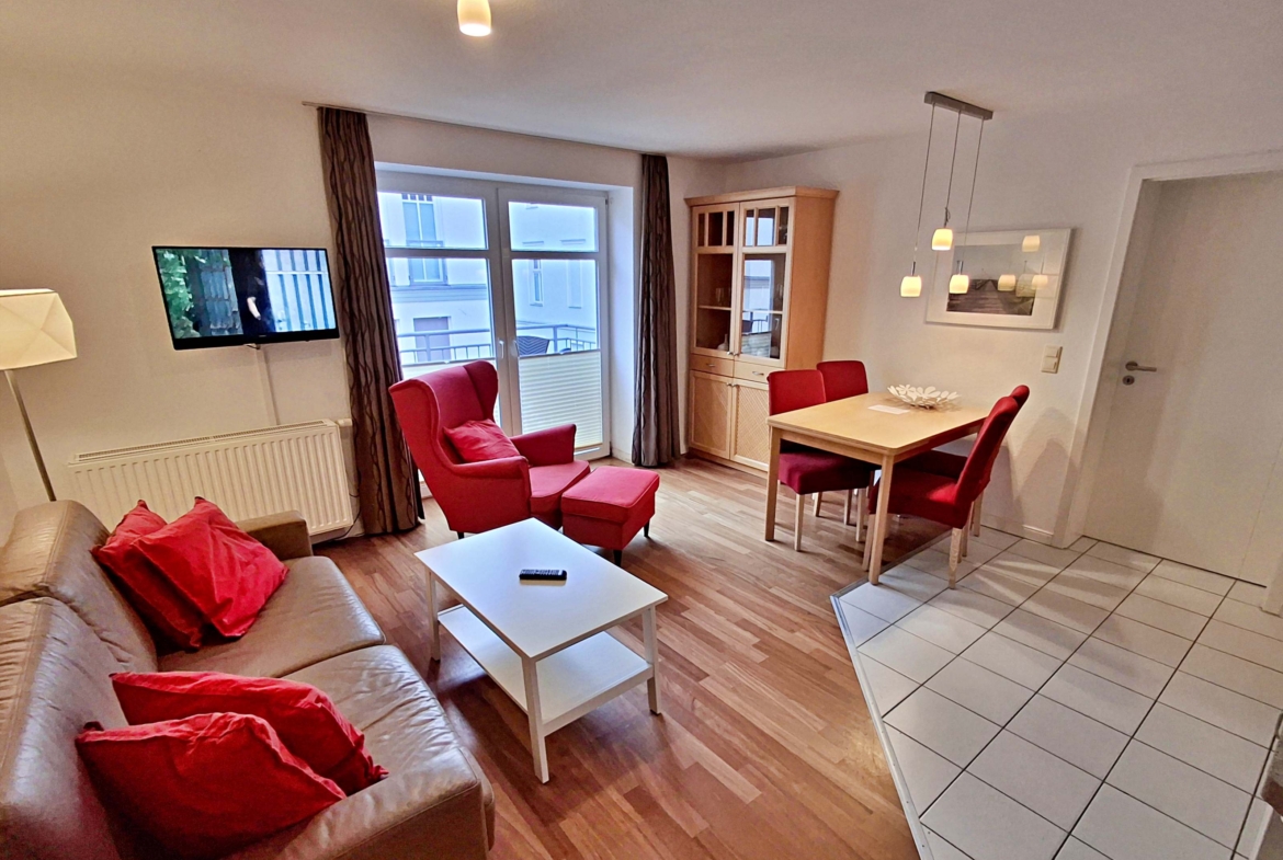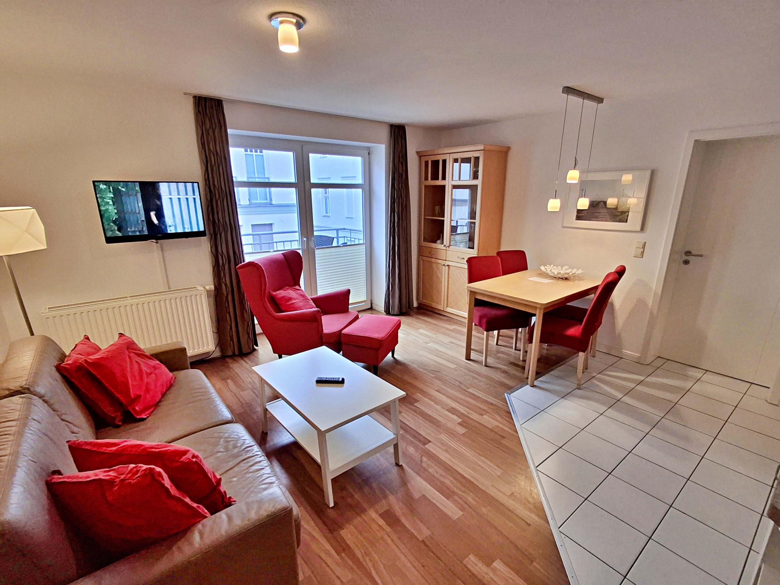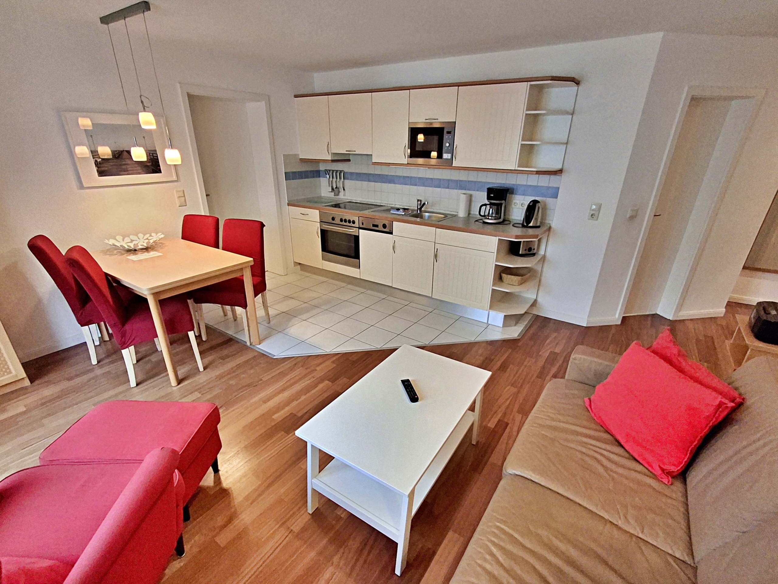 Wohnbereich mit Couch, Sessel, Essbereich und Nord-Ost-Balkon. Moderne Küchenzeile, Flachbild-TV, Radio-CD-Player, WLAN. Zwei Schlafzimmer mit Doppelbett und Frame-TV, Bad mit Dusche/WC.