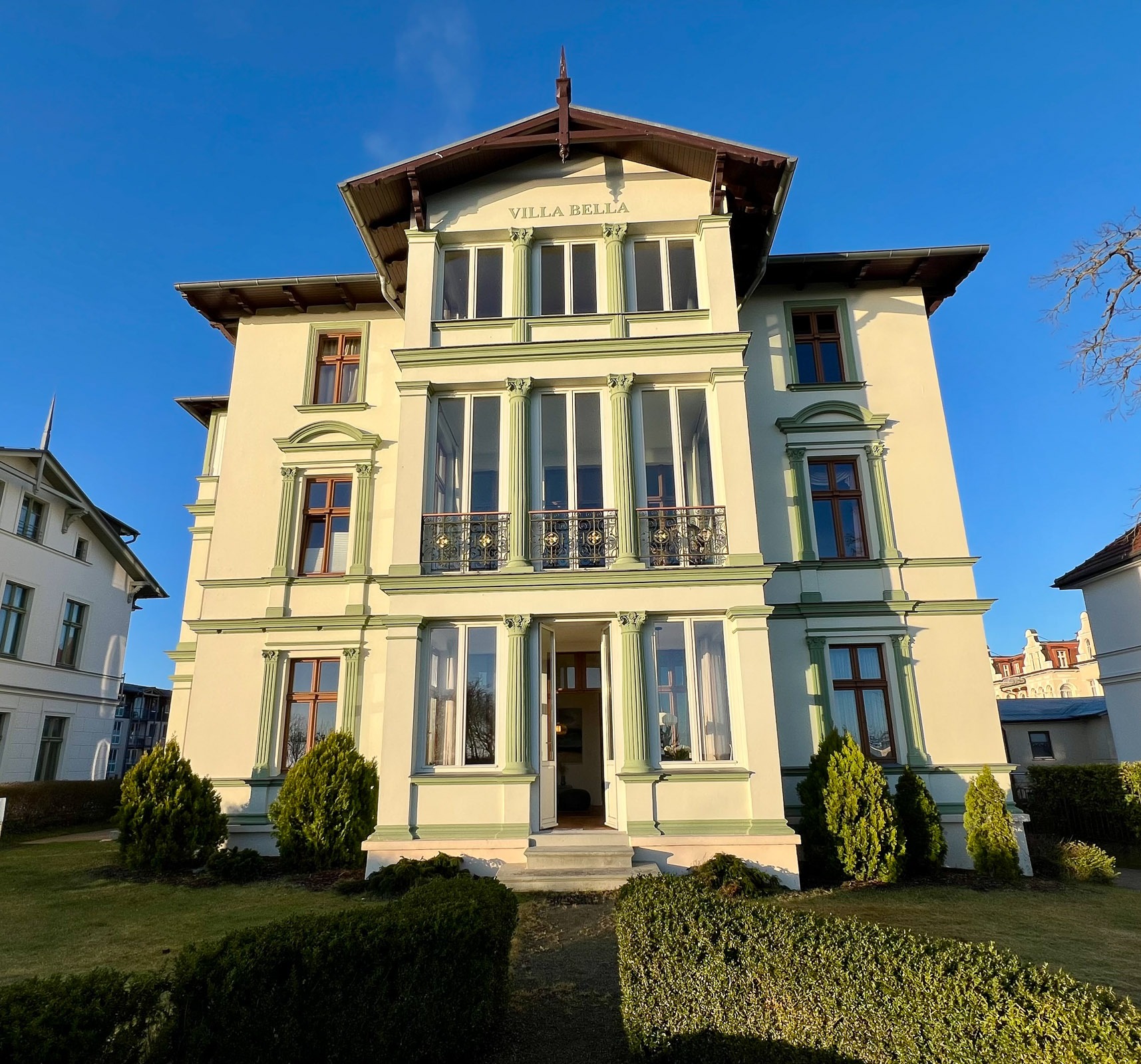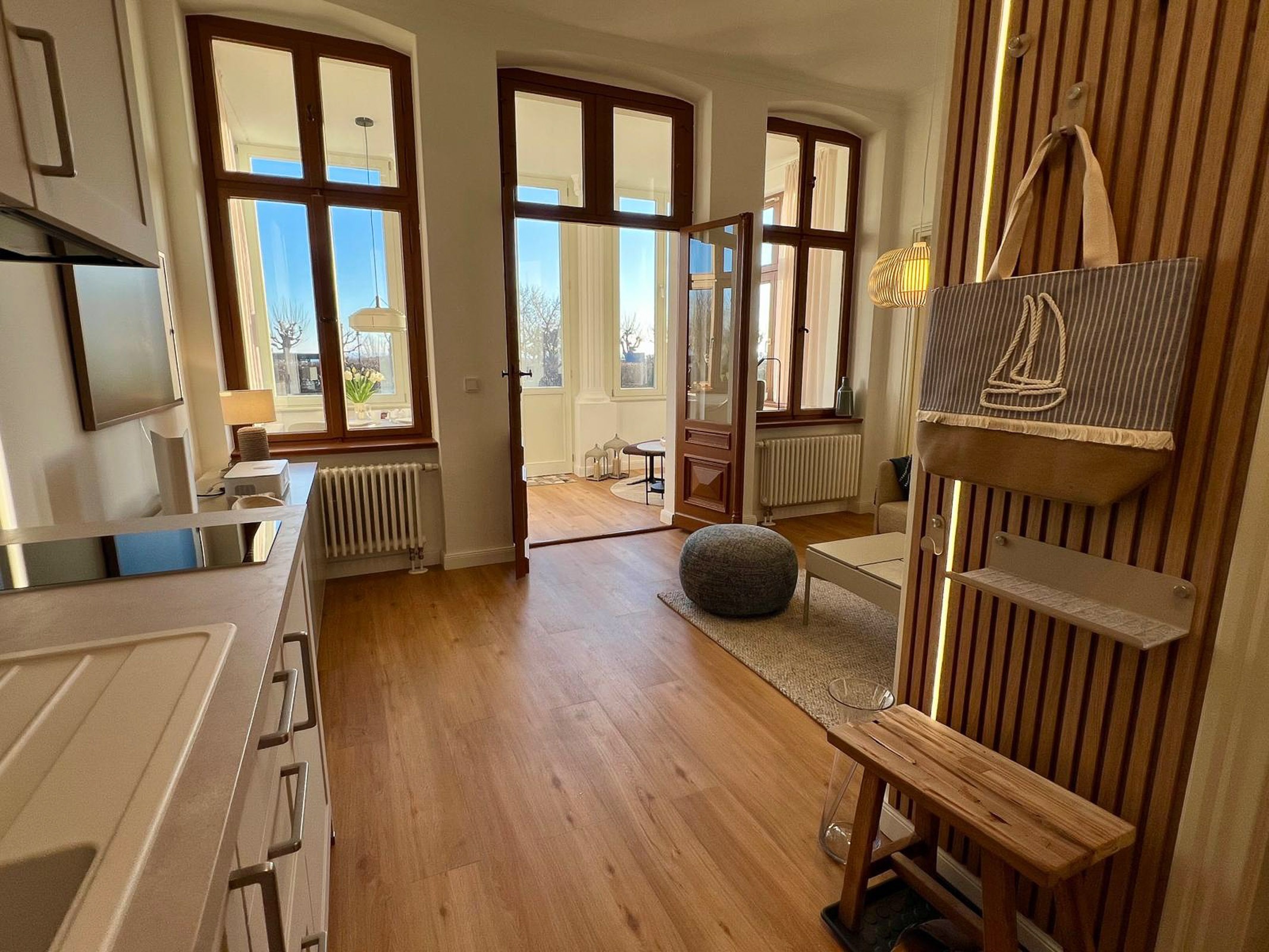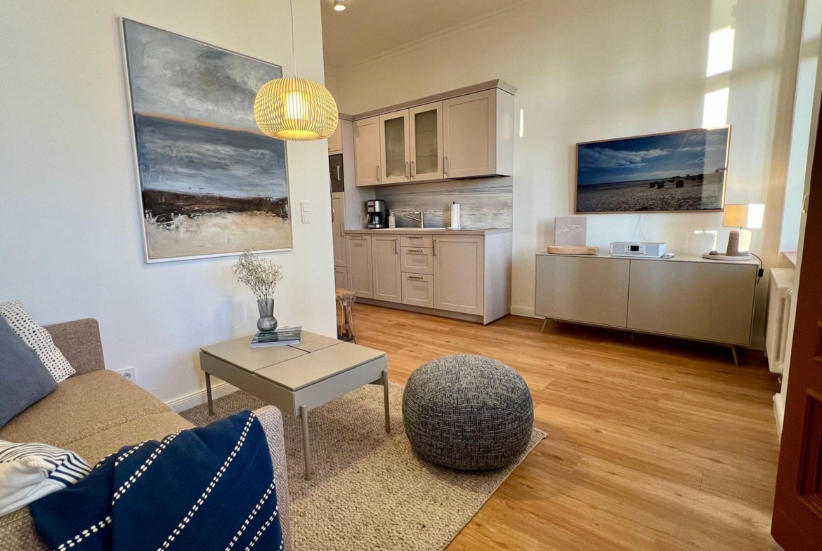 Die Ferienwohnung Nr. 2 befindet sich im Erdgeschoss des Hauptgebäudes der Villa Bella und hat eine Größe vom 47m². Sie verfügt über einen kombinierten Wohn-/Küchenbereich (Küchenzeile), mit Elektrokamin und einem großen Flachbildfernseher, ein Bad mit Dusche und WC sowie Erstausstattung von Toilettenpapier und Spülmittel, ein separates Schlafzimmer mit Doppelbett und eine schöne Loggia (Veranda) mit Blick in den Garten zur Ostseeseite. Der Essbereich befindet sich in der Loggia bzw. die Gäste können an schönen Tagen direkt im Garten vor der Villa die frische Seeluft genießen (Tisch und Stühle für den Garten stehen zur Verfügung). In der Loggia und im Wohnzimmer befinden sich jeweils eine gemütliche Couch-Garnitur zum Relaxen.