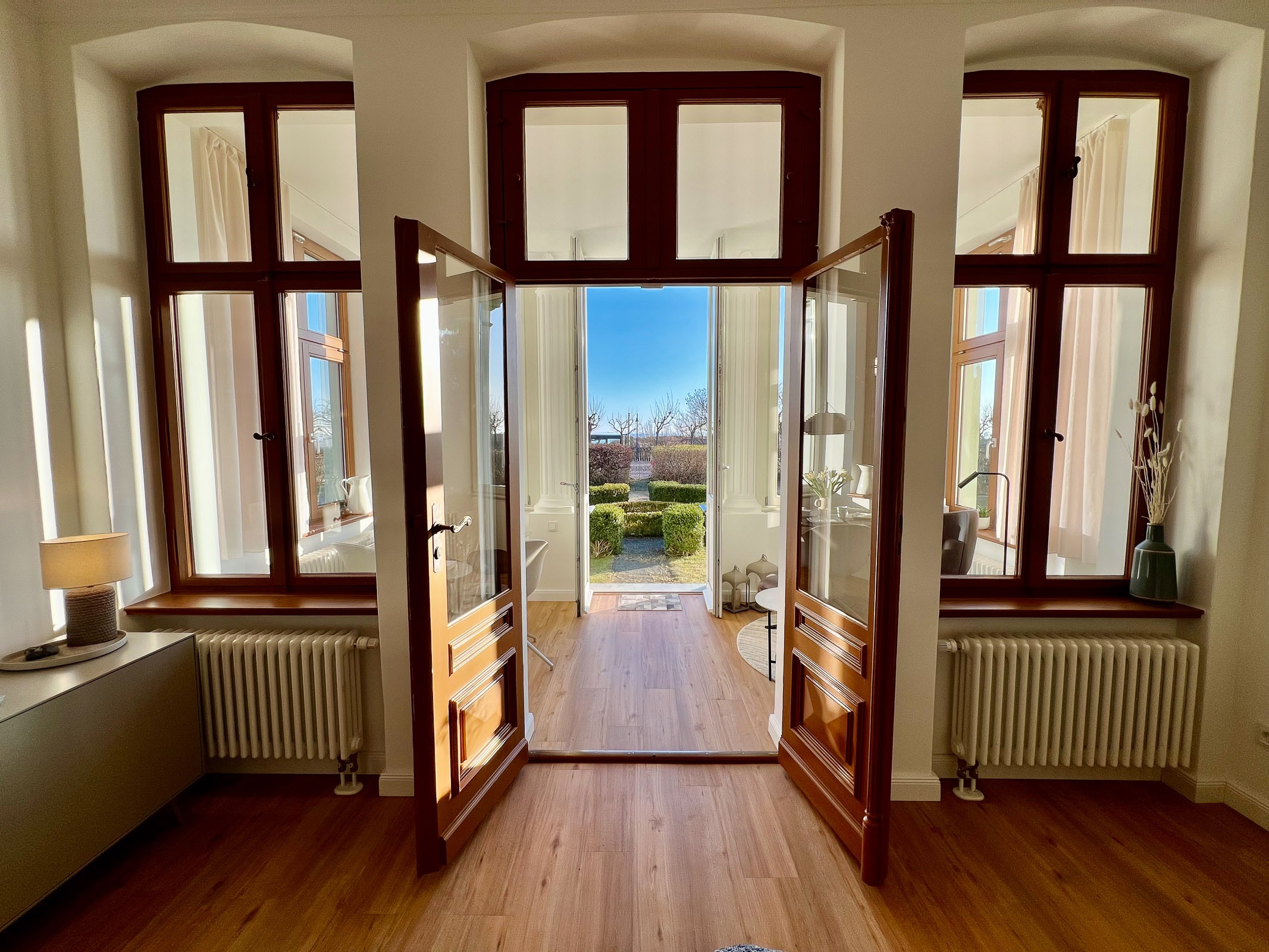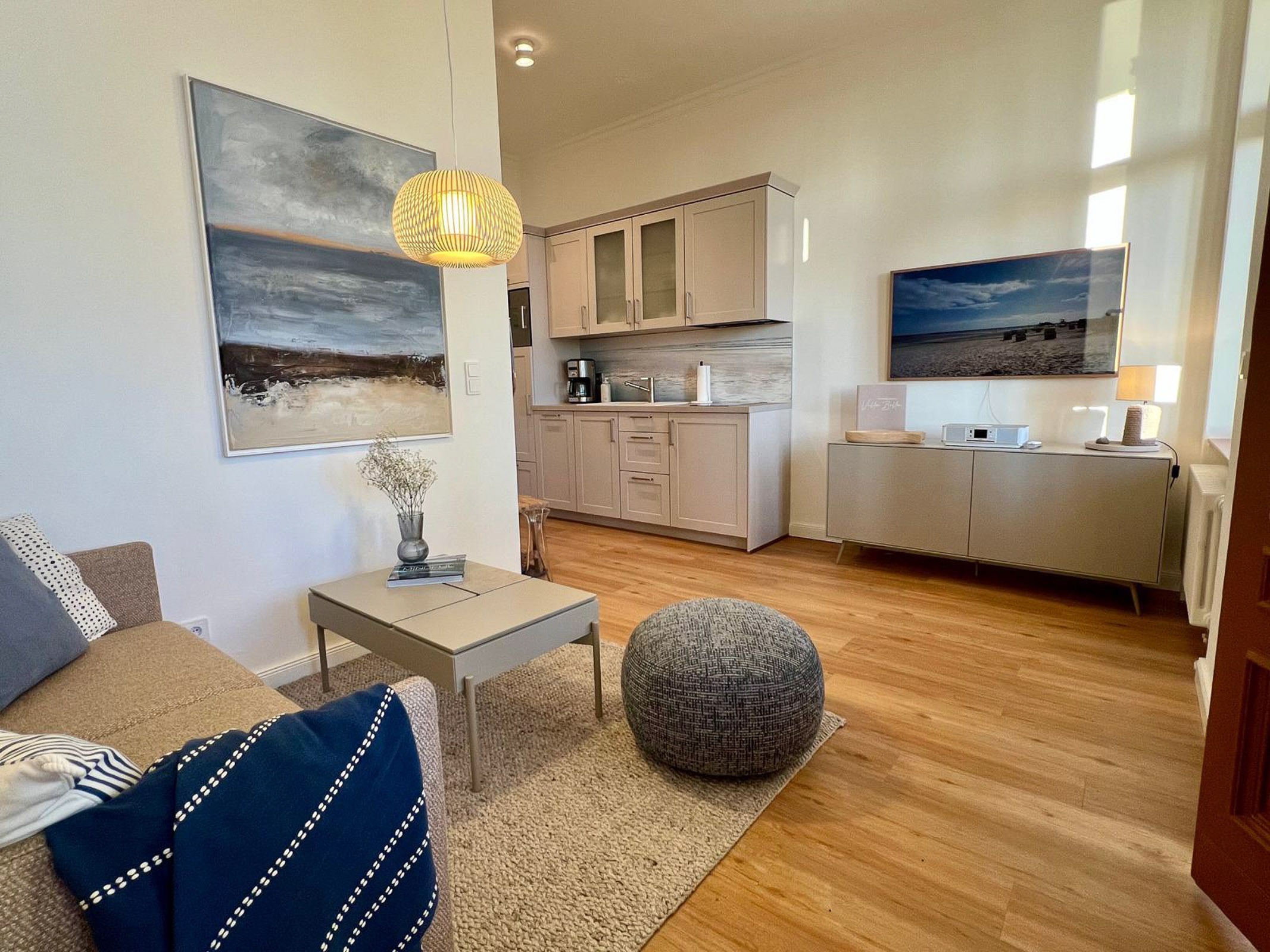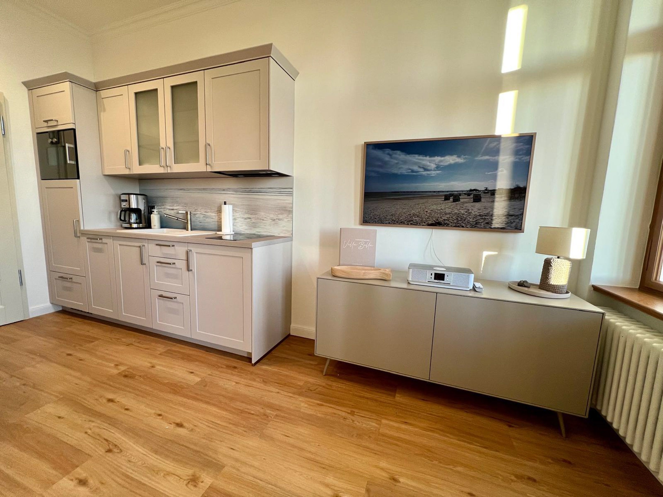 Die Ferienwohnung Nr. 2 befindet sich im Erdgeschoss des Hauptgebäudes der Villa Bella und hat eine Größe vom 47m². Sie verfügt über einen kombinierten Wohn-/Küchenbereich (Küchenzeile), mit Elektrokamin und einem großen Flachbildfernseher, ein Bad mit Dusche und WC sowie Erstausstattung von Toilettenpapier und Spülmittel, ein separates Schlafzimmer mit Doppelbett und eine schöne Loggia (Veranda) mit Blick in den Garten zur Ostseeseite. Der Essbereich befindet sich in der Loggia bzw. die Gäste können an schönen Tagen direkt im Garten vor der Villa die frische Seeluft genießen (Tisch und Stühle für den Garten stehen zur Verfügung). In der Loggia und im Wohnzimmer befinden sich jeweils eine gemütliche Couch-Garnitur zum Relaxen.